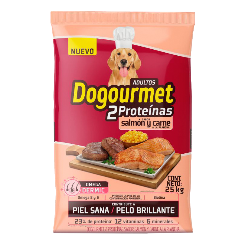 Dogourmet 2 proteinas sabor a salmon y carne a la plancha, alimento seco super premium con una combinacion de nutrientes e ingredientes que contribuyen a la salud y bienestar de tu perro, sistema nutricional omega dermic con omegas 3, 6 y biotina que fortalecen y protegen la piel y el pelo de la contaminacion y cambios de clima, cntribuyen a nutrir las celulas para garantizar una piel saludable y un pelo brillante. Contiene 2 fuentes de proteinas de origen animal que contribuyen a manetner musculos sanos y fuertes, con una formula enriquecida con Vitaminas A y E que ayudan a mantener una buena vision y fortalecer el sistema inmune. Las Vitaminas de complejo B contrinuyen a la vitavilidad y energia que tu perro necesita en la etapa adulta. Con calcio y fosforo para fortalecer los huesos y dientes, ademas contiene microminerales que contribuyen al optimo funcionamiento metabolico de tu perro.